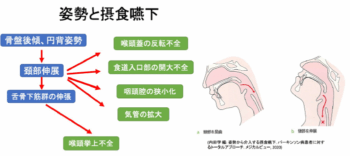 具体的には、喉頭蓋の反転不全や食道入口部の開大不全、喉頭挙上不全などで誤嚥しやすくなります。また、下顎挙動が制限されるため舌が後退し、食塊形成不全にもなります。