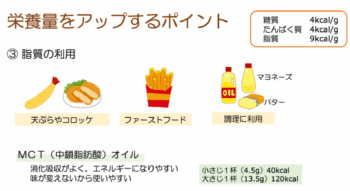 在宅の食支援と言うと、食形態の変更や一口量の調整、とろみ付けなどもありますが、栄養量アップにも気を付ける必要があります。