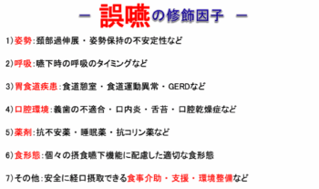 単に誤嚥の因子を説明するだけではご家族や介護職員も納得できないないでしょうから、実際の食事の様子を観察した上で、むせ、誤嚥の原因を推定する必要があります。