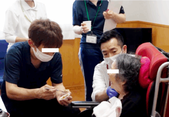 むせているということは、大なり小なり誤嚥していることが考えられるため、誤嚥性肺炎の発症原因を説明して、歯科が介入することのほか、普段の生活において注意すべきことや場合によっては他職種の協力が必要なことを説明します。