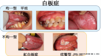 白板症は、口腔粘膜に生じた白色の板状あるいは斑状の角化性病変で擦過しても除去できない病変で、癌化率は5〜17%ほどで紅板症に比べると低いですが、不均一型白板症に分類される紅白板症、疣贅型は悪性化しやすいため要注意です。