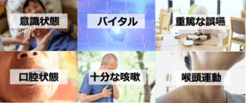 また、嚥下機能が低下していると食べ物が咽頭に残留しやすくなっており、嚥下後誤嚥を引き起こす可能性があるため、咽頭残留物を除去することも必要になります。
